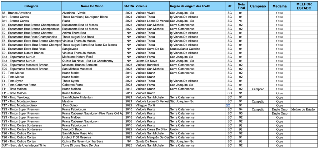 Santa Catarina também mantém posição de destaque com seus vinhos de altitude, com três campeões: