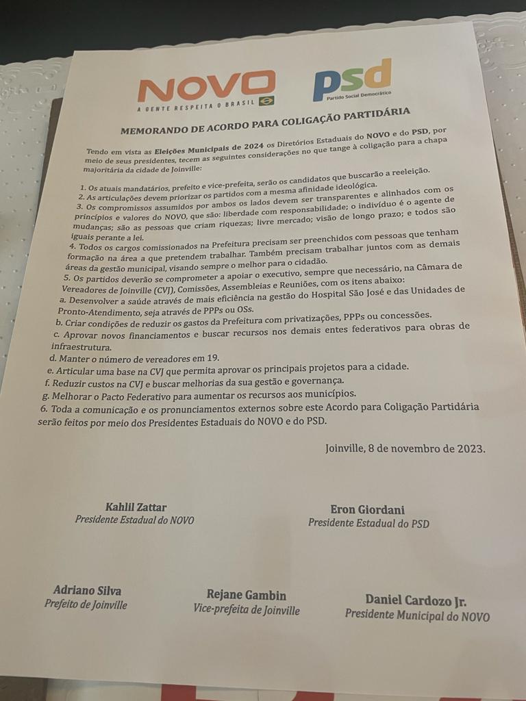 O memorando, explicou Adriano Silva, é uma forma de deixar claro aos militantes do Novo os termos do acordo celebrado de portas abertas e sem interesses pessoais. O documento traz seis pontos de acordo, parte programáticos, parte ideológicos e até pontos práticos, como a defesa de não aumentar o número de vereadores em Joinville – hoje são 19, mas a legislação permite que sejam 25 cadeiras.