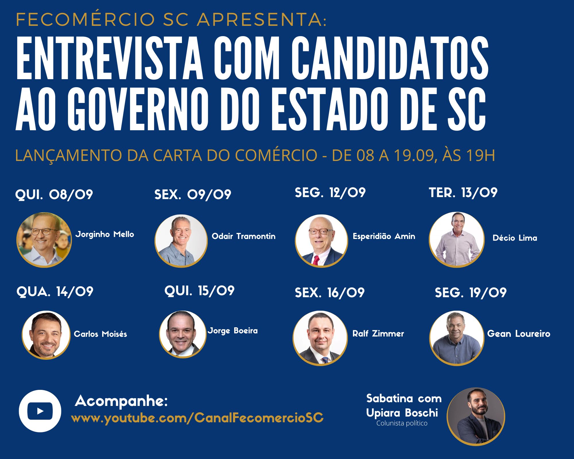 A Fecomércio SC começa a veicular a partir desta quinta-feira a série de sabatinas realizadas com oito candidatos ao governo de Santa Catarina. Participam da série Jorginho Melo (Partido Liberal), Odair Tramontin (Novo), Esperidião Amin (Progressistas), Décio Lima (Pt), Carlos Moisés (Republicanos), Jorge Boeira (Pdt), Ralf Zimmer (Pros) e Gean Loureiro (União Brasil).