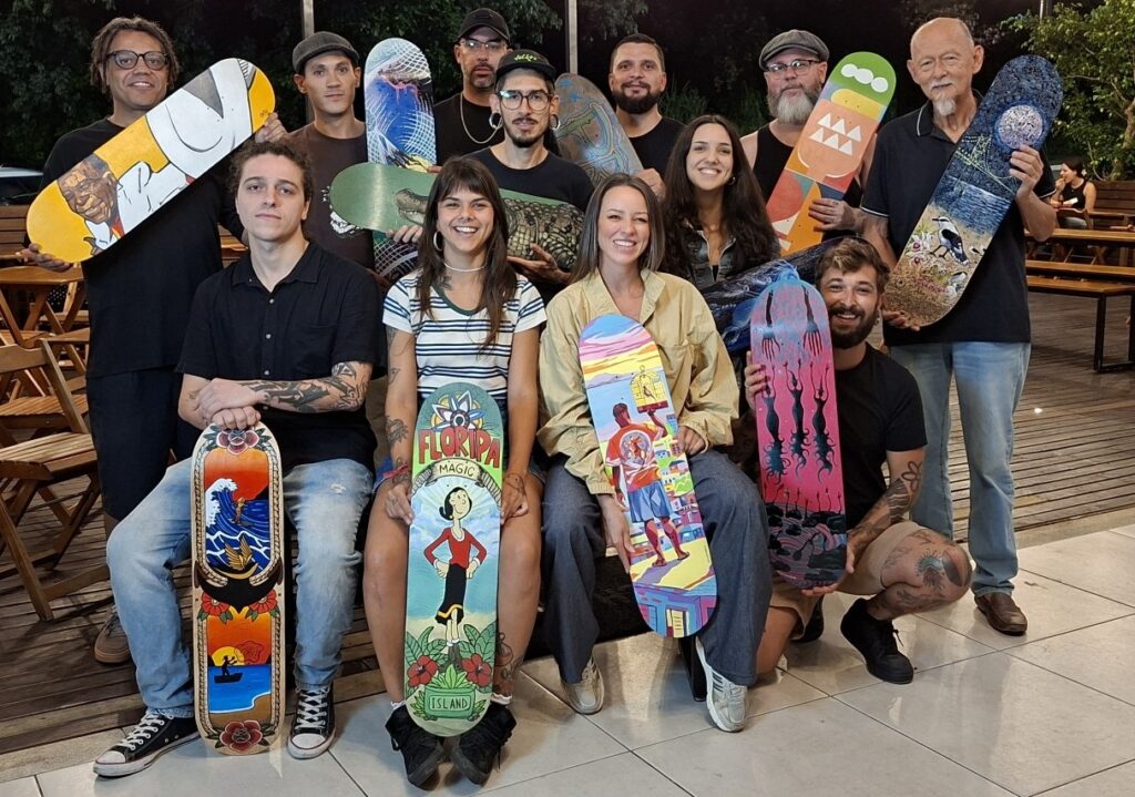Onze artistas transformaram shapes de skate em obras de arte que serão conferidas pelo público na mostra coletiva que abre no próximo dia 10 no Moochacho, na Trindade, em Florianópolis. A exposição faz parte da primeira edição do “Skate Art”, projeto que une arte, esporte e ação social e tem a curadoria de Juliano Zanotelli. Participam desta edição os artistas Dimmer, Gabriela Olivia, Jefsu, João Aguiar, Macaco, Marcelo Camacho, Nadyne Garcia, Roberta Bridi, Rodrigo Levél, Rodrigo Rizo e Wagner Kuroiwa. Parte do arrecadado com a venda das obras será destinada à Associação dos Skatistas da Costeira do Pirajubaé (Ascop), que oferece aulas gratuitas para cerca de 50 crianças e jovens. O medalhista olímpico Pedro Barros doou um shape exclusivo para a mostra. A peça foi criada durante a pandemia, em parceria com Harry OG Jumonji, skatista brasileiro lendário e pioneiro do street skate em Nova York nos anos 1980/90.