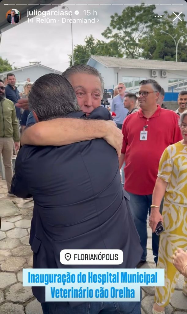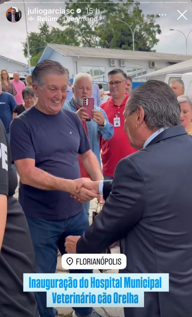 A inauguração, nesta quinta-feira, do Hospital Veterinário Público de Florianópolis, que leva o nome do Cão Orelha, reuniu o prefeito da capital, Topázio Neto, e Júlio Garcia no mesmo evento. Júlio é apoiador da vereadora por Florianópolis e defensora da causa animal, Pri Fernandes (PSD), pré-candidata a deputada estadual. Nos bastidores, Topázio tem reforçado seu apoio à pré-candidatura do amigo a deputado federal. Nas redes sociais, Júlio registrou o encontro com o amigo Topázio e a coluna, claro, estava de olho. Veja:
