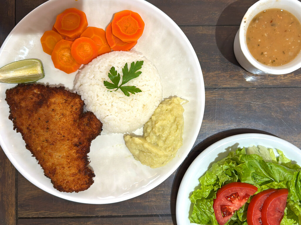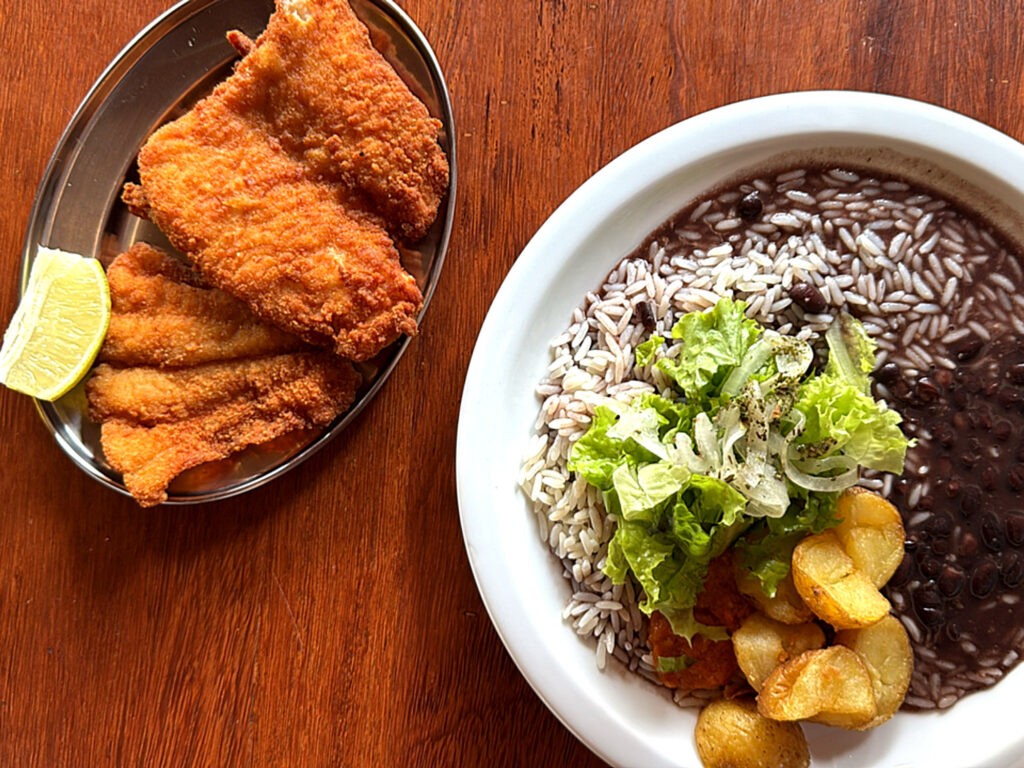 Começou como cafeteria, mas os almoços acabaram fazendo mais sucesso. Ali, os PFs saem por R$ 34,90 e sua versão menor (júnior), R$ 28,90. No dia em que estive lá, pedi filé de tilápia à milanesa com arroz, feijão carioca, salada, purê de batata doce e legumes (foto). O cardápio ainda contava com clássicos como bife acebolado, frango grelhado e uma suculenta carne de panela.