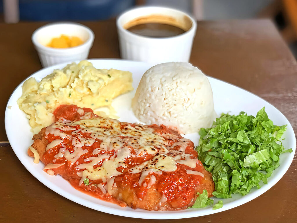Os especiais começam pelo estrogonofe de carne na segunda e carne de panela na terça. Na quarta, o frango à parmegiana (foto) faz o maior sucesso; quinta tem strogonoff de frango e peixe à milanesa e, na sexta, bife à parmegiana. Os pratos especiais e seus acompanhamentos variam de R$ 31,90 a R$ 34,90.