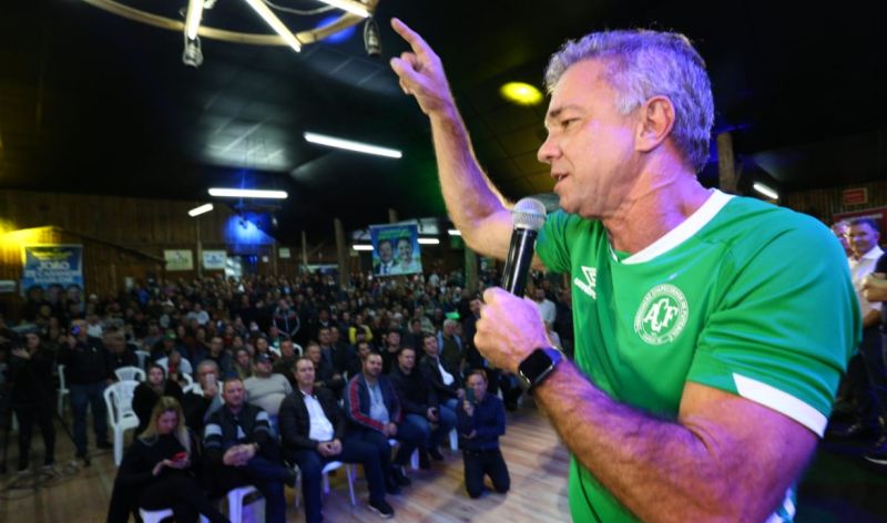 Com direito a camiseta da Chapecoense e um enorme banner no palco com a foto do presidente Jair Bolsonaro (Pl), o pré-candidato a governador Gean