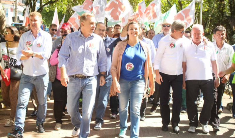 Repare ao fundo as bandeiras tremulantes com o 15 do Mdb. Repare que logo atrás dele está o hoje senador Jorginho Mello (Pl). Mais à direita, o senador Dário Berger (Mdb) e o deputado estadual Marcos Vieira (Psdb) comentam alguma coisa. Na esquerda, o então candidato a vice-prefeito João Batista Nunes (Psdb). Quatro anos depois, quando Gean foi reeleito, dessa fotografia só permaneceu a mulher, Cíntia, a seu lado.