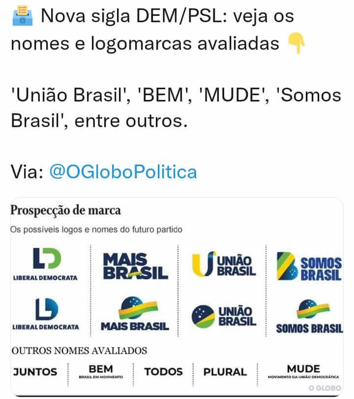 Devem estar certos, fazem caríssimas pesquisas para descobrir o que o eleitor acha que quer. Mas não deixa de ser triste, porque o nome do novo partido poderia dar uma indicação mais clara sobre o que Democratas e Psl juntos significam e como querem se colocar no tabuleiro político. Na mesma quarta-feira, o jornal O Globo divulgou quais as outras opções em estudo para nomear o partido. Poucas diferenças em relação à ideia de fazer política sem parecer muito político: “Mais Brasil”, “Somos Brasil”, “Juntos”, Plural” “Mude (Movimento da União Democrática). Também estava lá o cafona Bem – Brasil em Movimento. Eu, como jornalista de política, livrei-me de ter que dizer que “fulano é do Bem”.