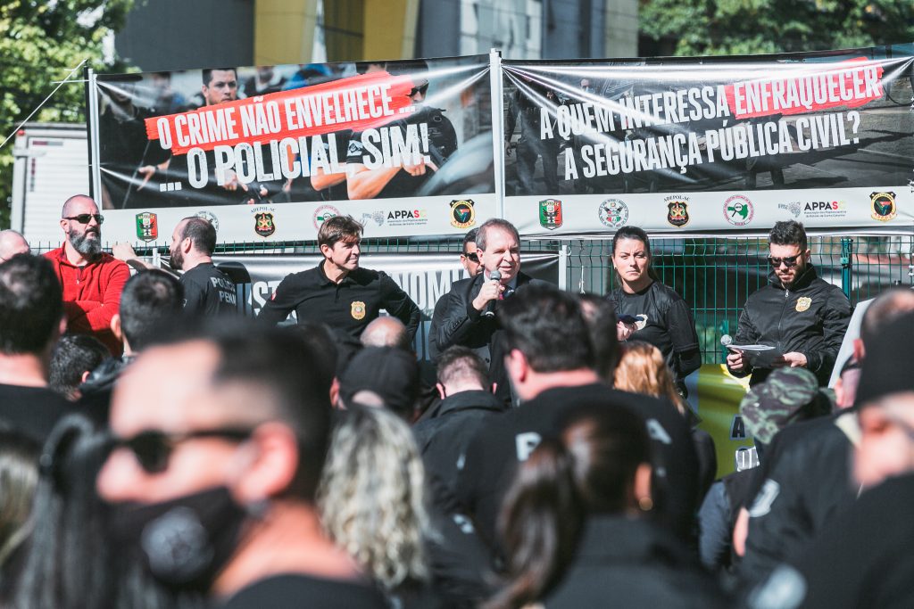 Manifestação dos policiais civis, todos trajados de preto, impressionou quem passou pela Assembleia Legislativa nesta terça-feira. Em uma das fotos, o deputado estadual Maurício Eskudlark (Pl), delegado aposentado, discursa para os colegas da categoria. Fotos: Bruno Collaço.