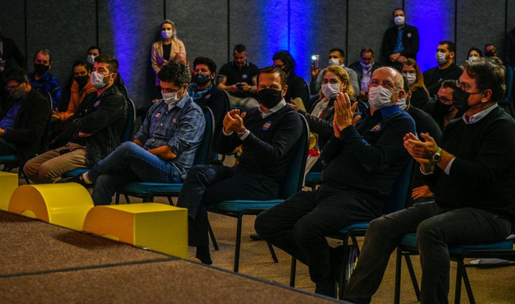 Dória ao lado de Vinicius Lummertz e longe de Merisio. O pré-candidato ao governo de SC elogiou o governador paulista, mas vai apoiar Eduardo Leite na prévia. Foto: Antonio Carlos Mafalda, Mafalda Press