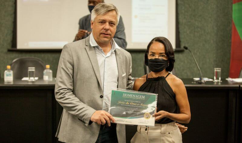 Nesta quarta-feira, faz 160 anos que nasceu em Desterro, atual Florianópolis, o poeta João da Cruz e Sousa. Na segunda, o deputado estadual Fabiano da Luz (Pt) recebeu Emilene Cruz e Sousa, trineta do escritor simbolista, durante a 1ª Conferência de Políticas Públicas de Promoção da Igualdade Racial em Santa Catarina, no Plenarinho da Alesc, quando entregou a ela um documento simbólico reconhecendo o tataravô como promotor público – cargo para o qual foi aprovado em 1883 e teve negado o ingresso. A revisão histórica foi aprovada em 2016 pela Alesc, com apoio do próprio Ministério Público de Santa Catarina. Fabiano da Luz foi autor do projeto que denominou em 2020 o antigo Espaço Didático Cultural da Assembleia como Espaço Promotor Público e Poeta Cruz e Sousa. Emilene ficou muito emocionada com a homenagem a Cruz e Sousa e também emocionou com as palavras fortes e belas que disse que recebeu o certificado.