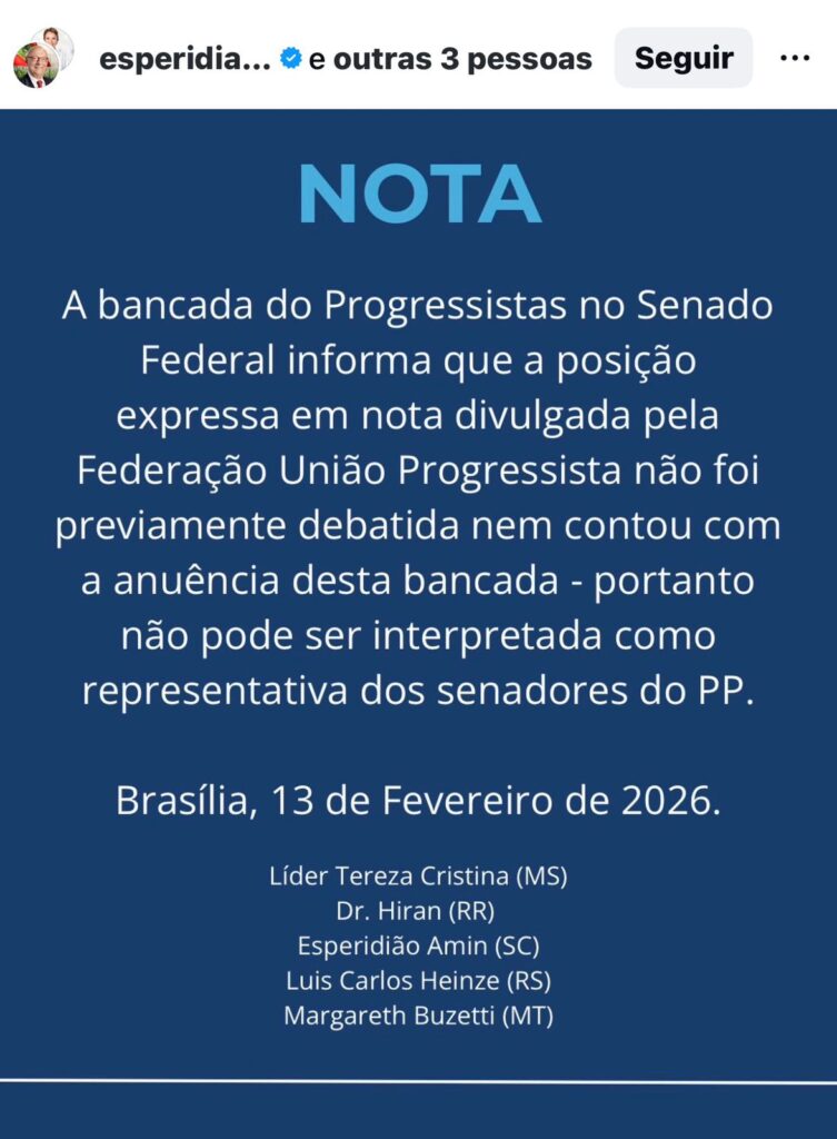 A nota da federação União Progressista em defesa da atuação do ministro Dias Toffoli, do Supremo Tribunal Federal (STF) rachou a bancada do PP no Senado. Nota assinada pela líder Tereza Cristina (MS) e pelos colegas Esperidião Amin (SC), Dr. Hiran (RR), Luiz Carlos Heinze (RS) e Margareth Buzzetti (PP) “informa que a posição expressa em nota divulgada pela Federação União Progressista não foi previamente debatida nem contou com a anuência desta bancada, portanto, não pode ser interpretada como representativa dos senadores do PP”.